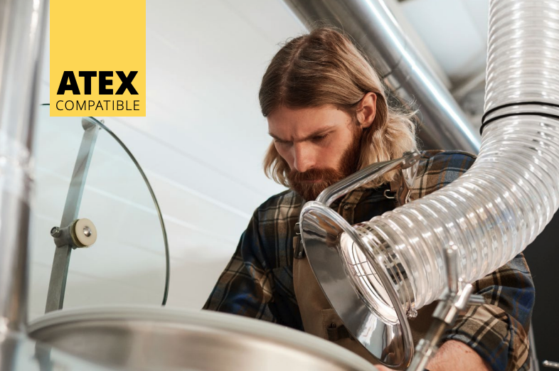 The extraction arm complies with the requirements of the ATEX directive for category 2 equipment for gas and dust, and it is suitable for use in zones 1 and 21 as well as 2 and 22.